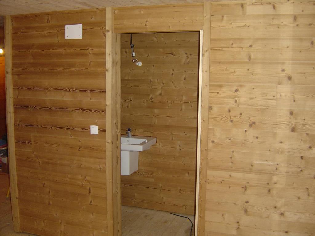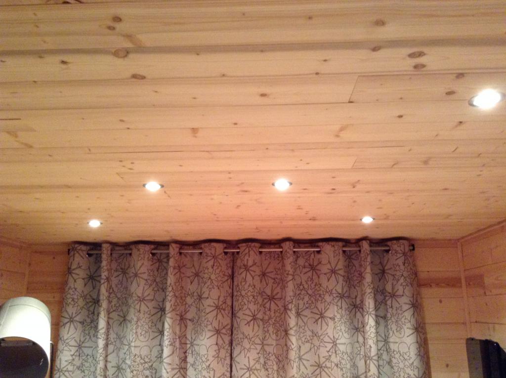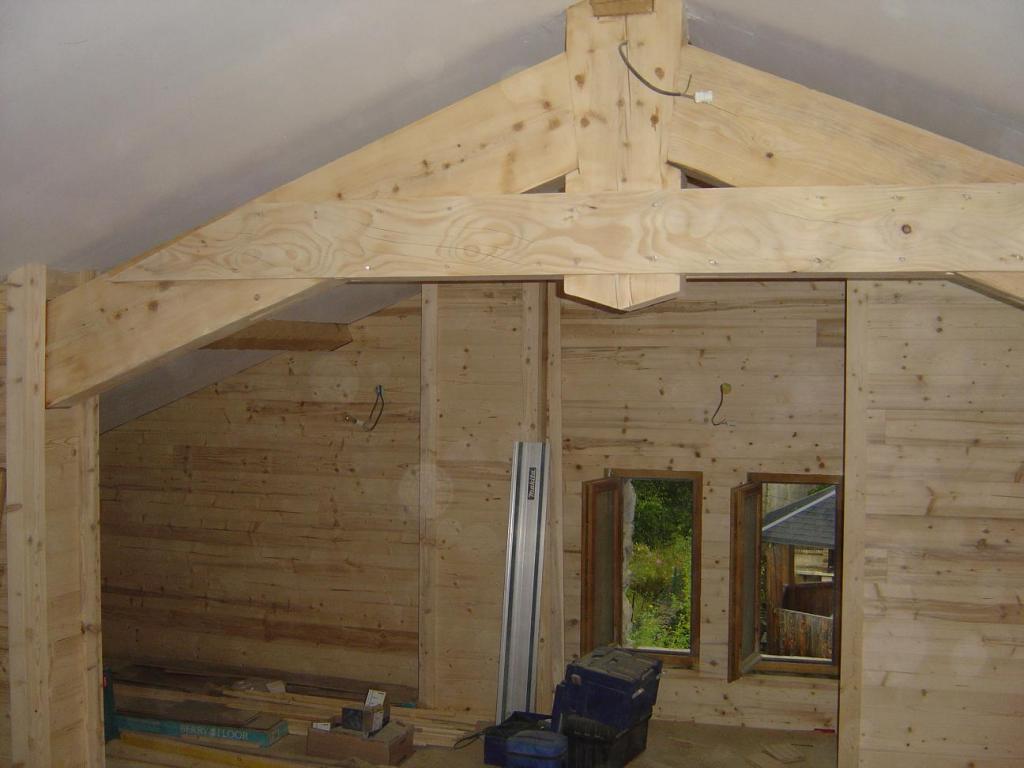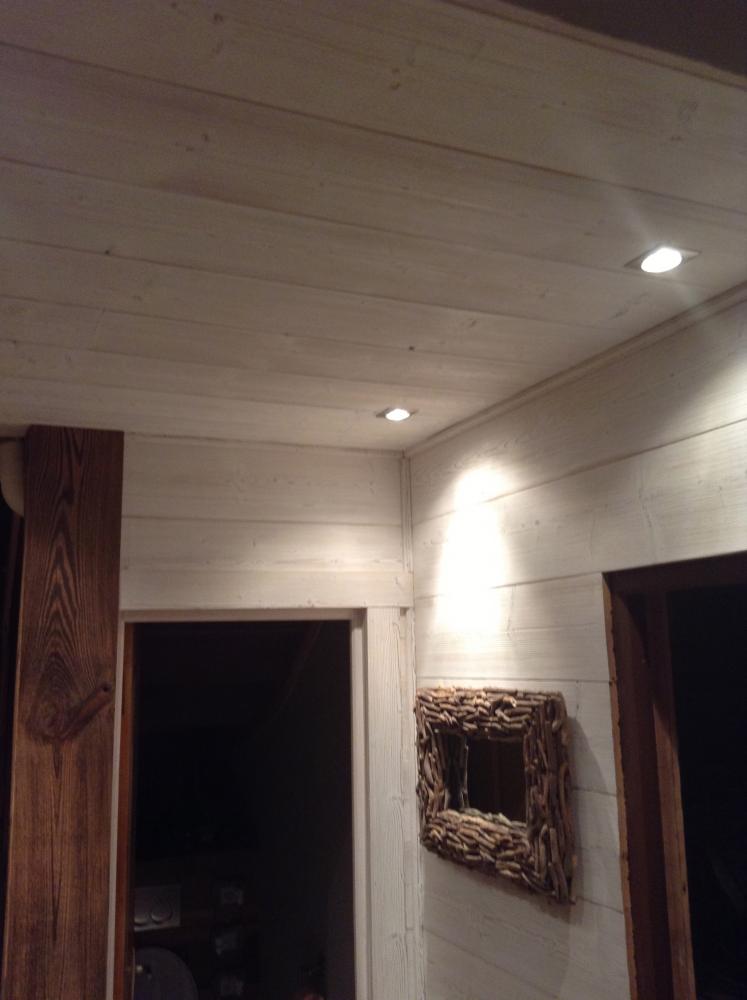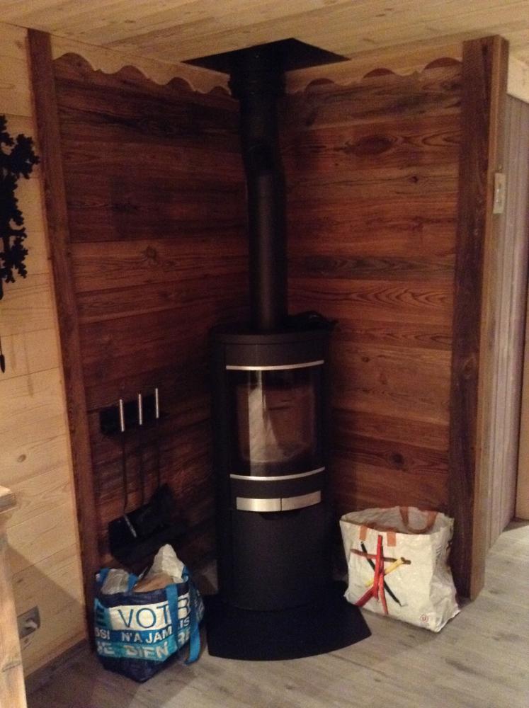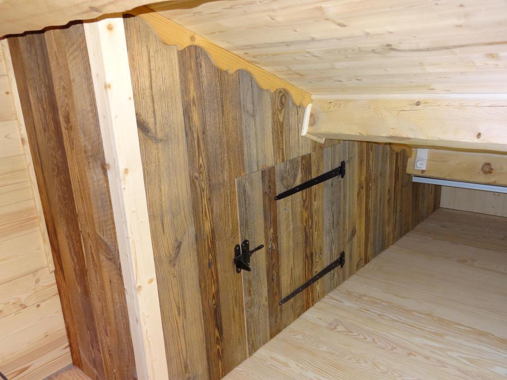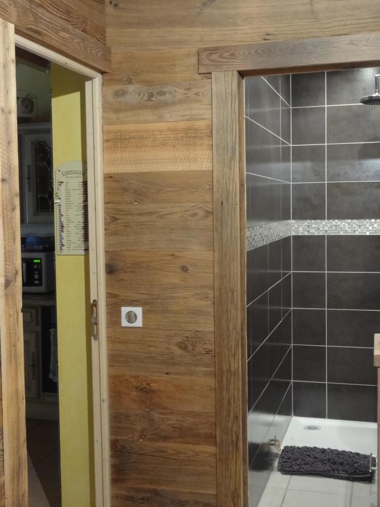 Habillage des murs en thermo-traité, en vieux bois.
